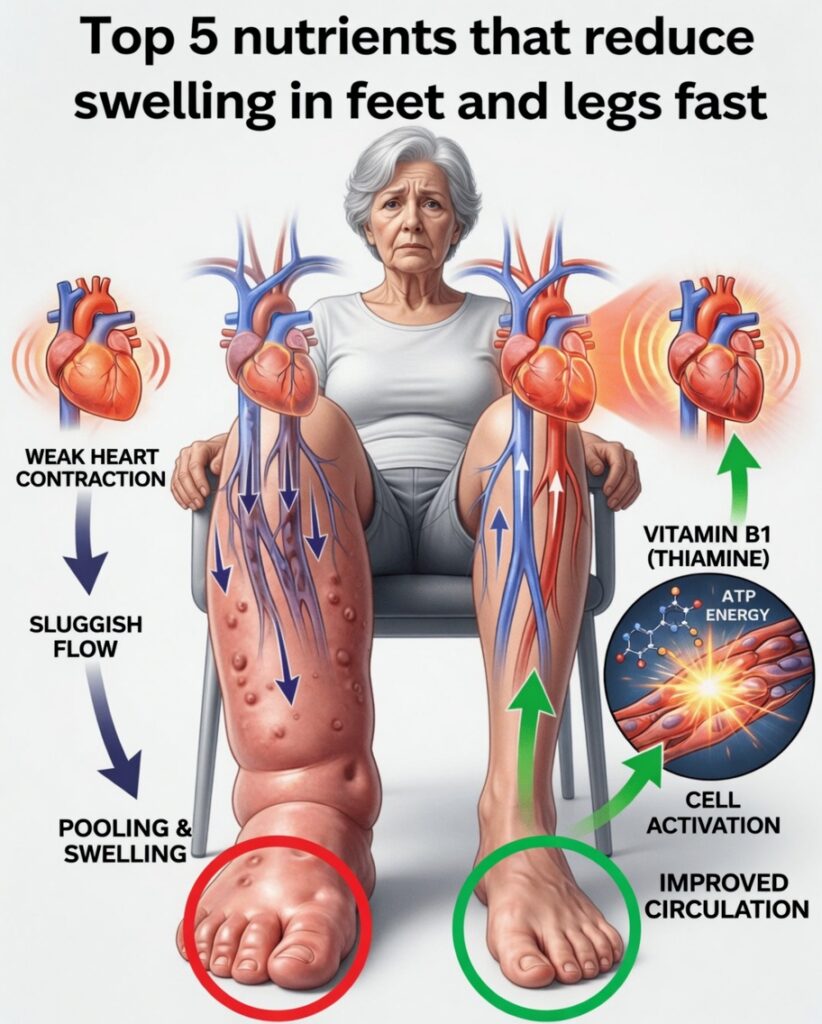 Thiamine (vitamin B1) helps convert food into energy and supports nerve function and heart health—all relevant to healthy circulation. In more significant deficiency states, circulation can be affected, potentially contributing to fluid buildup and swelling in the lower limbs. Research has also identified thiamine deficiency in some people experiencing heart-related edema.