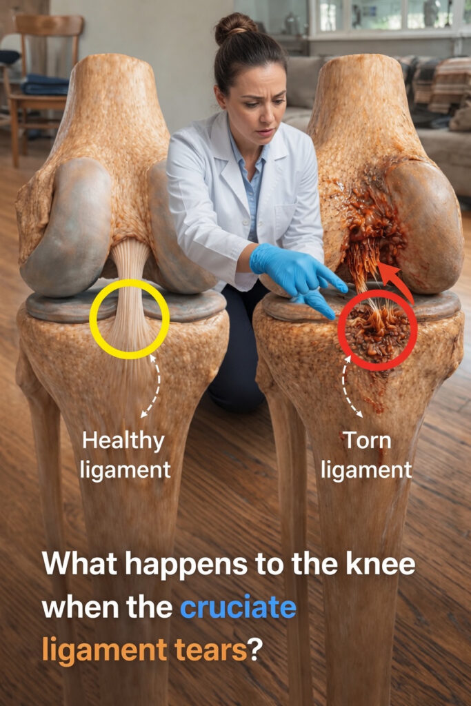 When a cruciate ligament is torn, the knee often remains unstable during twisting, pivoting, or sudden directional changes. If this instability continues, the knee may repeatedly give way. Over time, that can place extra stress on the cartilage and meniscus, increasing wear and tear and potentially raising the risk of osteoarthritis later in life.